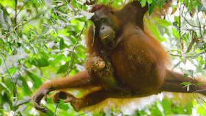 Das Orang-Utan-Mädchen Mina sehnt sich nach Freiheit, doch ihre Mutter will sie stets bei sich behalten. Eine klitzekleine Schildkröte krabbelt aus dem Sand.
