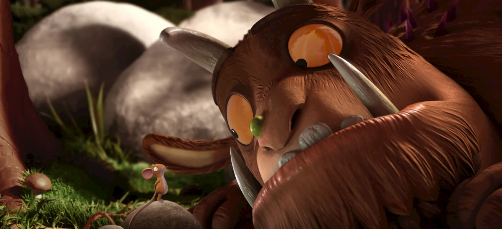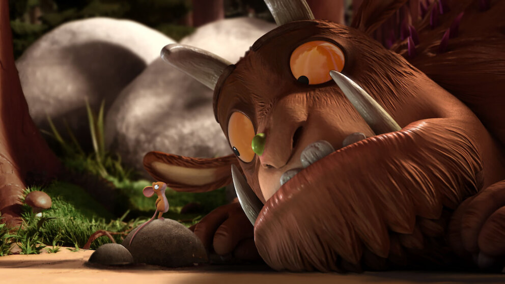 Eine Maus entgeht Schwierigkeiten, indem sie sich Geschichten über den monströsen Grüffelo ausdenkt – bis sie einem echten begegnet, der sie verspeisen möchte!