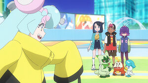 Dot faces off against Iono during a livestream battle. The Explorers follow the gang to Levincia to get more information about Terapagos.