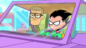 Robin unwittingly becomes part of a heist during his driver's ed test; Raven's supervillain dad has ulterior motives for befriending the other Titans.