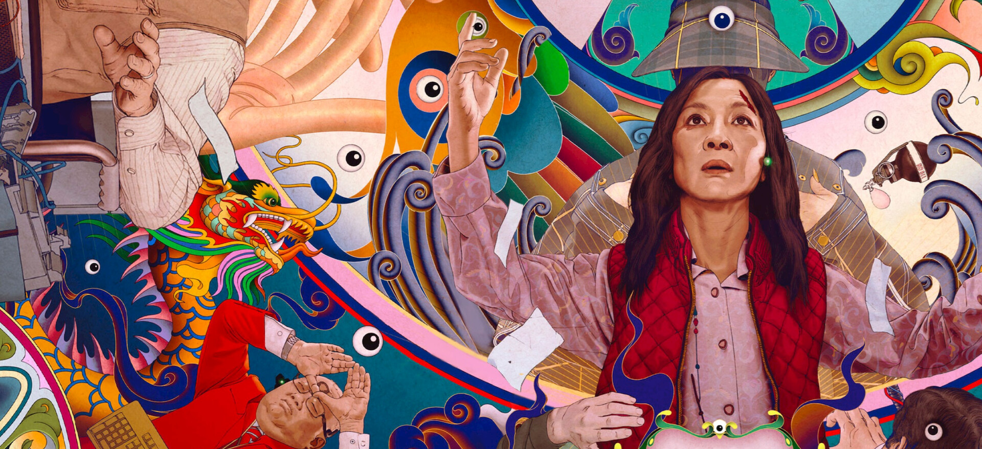 Michelle Yeoh, Ke Huy Quan, Stephanie Hsu, Jamie Lee Curtis, James Hong, Jenny Slate, Harry Shum Jr. y Tallie MedelTambién podrían gustarte
