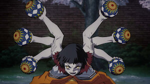 적의 목을 벴지만 탄지로의 위기는 계속된다. 한편 스사마루와 일대일로 맞서는 네즈코. 색실 공을 주고받으며 죽음의 랠리를 시작한다. 조심해, 실수하면 발목이 날아간다고.