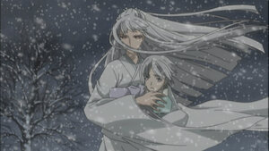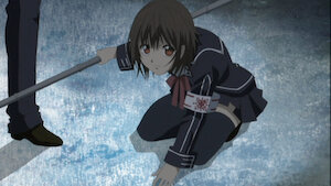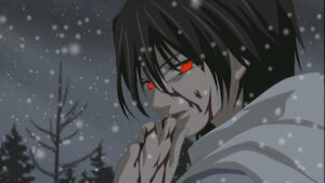 Seeing the state Yuki is in, Kaname takes her from Zero, who is speechless when he realizes what he has done. Yuki cries, unaware of Zero’s secret.