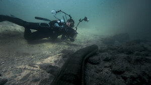 To defend one of the world's most feared aquatic species, Eric Cheng and diver Jim Abernethy photograph human-friendly tiger sharks in the Bahamas.