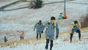 On a towering, snowy mountain, 25 athletes remove their blindfolds and start an arduous climb. It's a brutal taste of the physical and mental toll ahead.