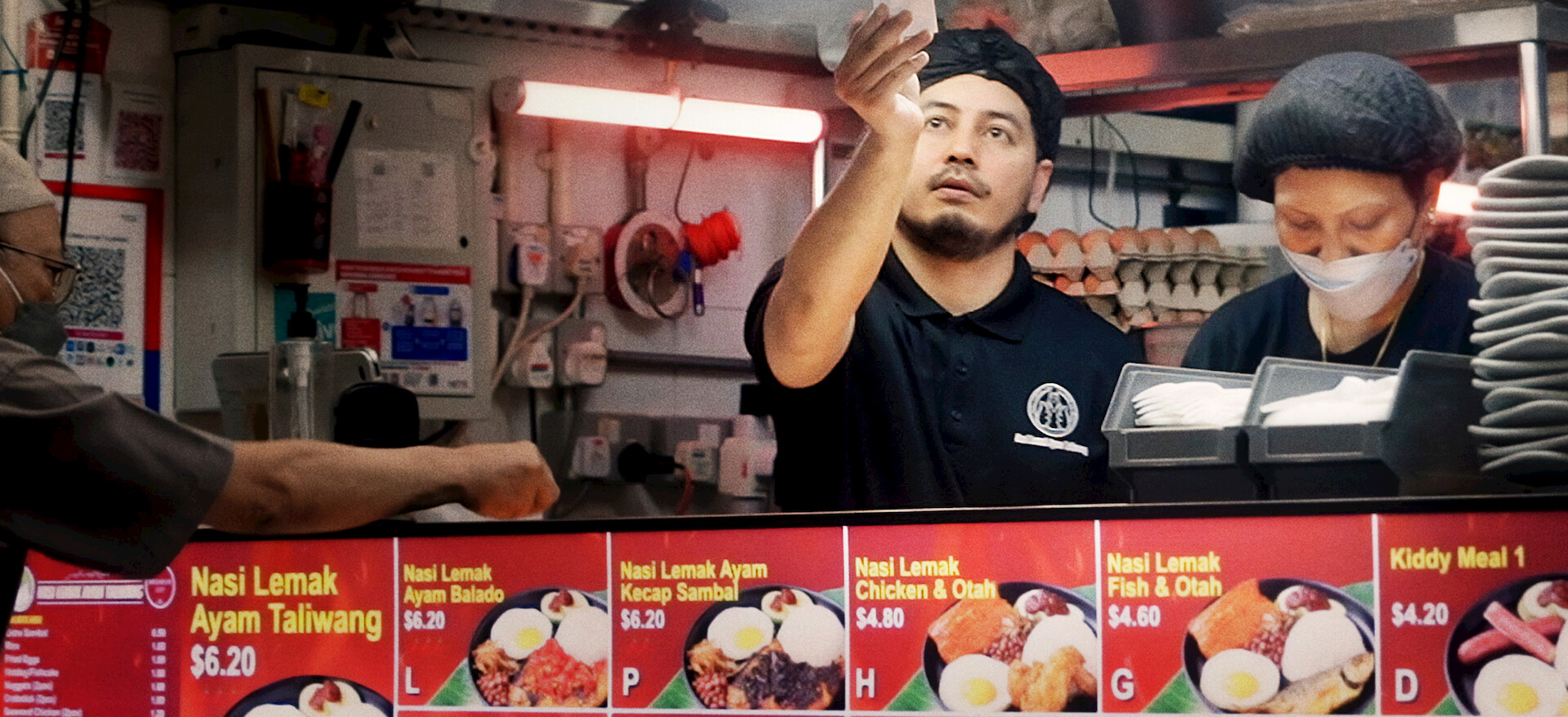 A couple serving Japanese-inspired rice and noodle bowls from their stall brings an elevated culinary approach to hawker food culture.