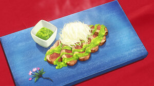 Soma diseña un plan cuando Inui, exalumna de Totsuki, le da el desafío de hacer un plato japonés con los ingredientes que se encuentran en el edificio y sus alrededores.