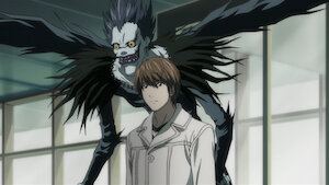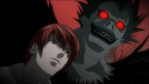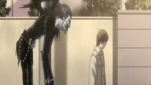 Ryuk, the Shinigami, or god of death, who dropped the Death Note into the human world, warns Light that someone is on his trail.