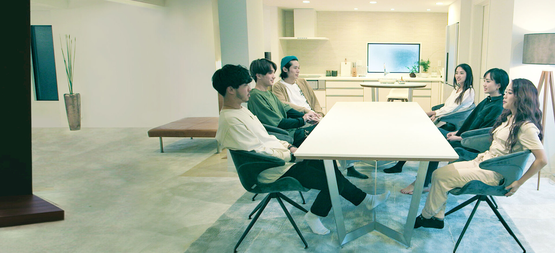 The members gather at their new house in Setagaya. Aged 20 to 31, with jobs from illustrator to actor, their time living together begins now.