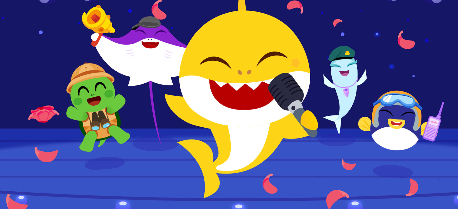 Baby Shark sings and cleans up the sea with his family, plays hide-and-seek with his friends, swims in an ocean parade and more!