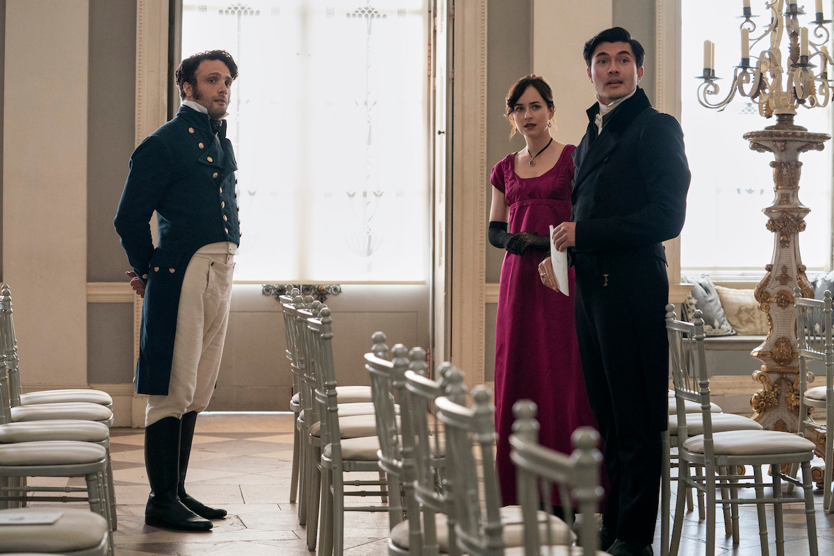 The cold open of Persuasion, based on an 1817 Jane Austen novel of the same name, depicts its lovers, highborn heroine Anne Elliot (Dakota Johnson) and sea captain Fredrick Wentworth (Cosmo Jarvis), canoodling by the water in sumptuous costuming. But it’s the next scene that really gives us insight into Anne. While unraveling her introductory voiceover — she loves wine and can’t help but roll her eyes at her posh family — she flashes a defiant glance at the camera and stares directly into it without fear. One thing about Anne Elliot is clear: Her demeanor is more 1970s rock goddess than timid Regency heroine.