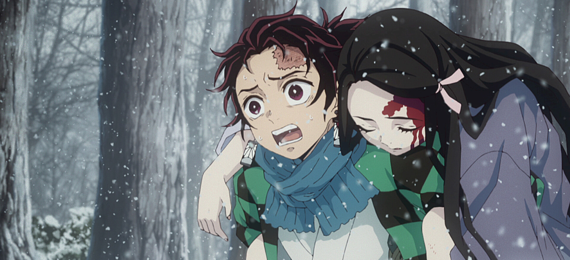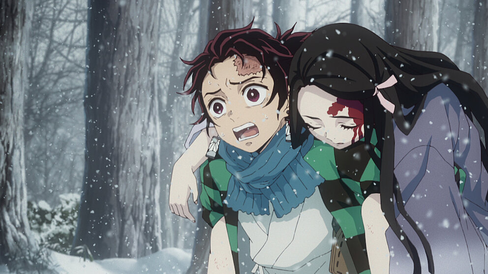 Тандзиро с сестрой отправляются в горы. По пути он чувствует запах крови из храма и обнаруживает в нем ужасающую картину.